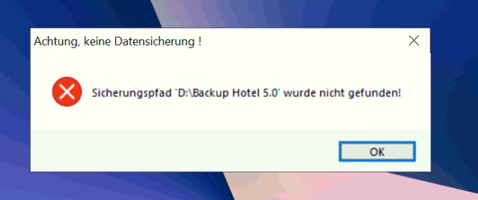 Achtung keine Datensicherung! Sicherungspfad 'D:\Backup Hotel 5.0' wurde nicht gefunden! ![]() | |